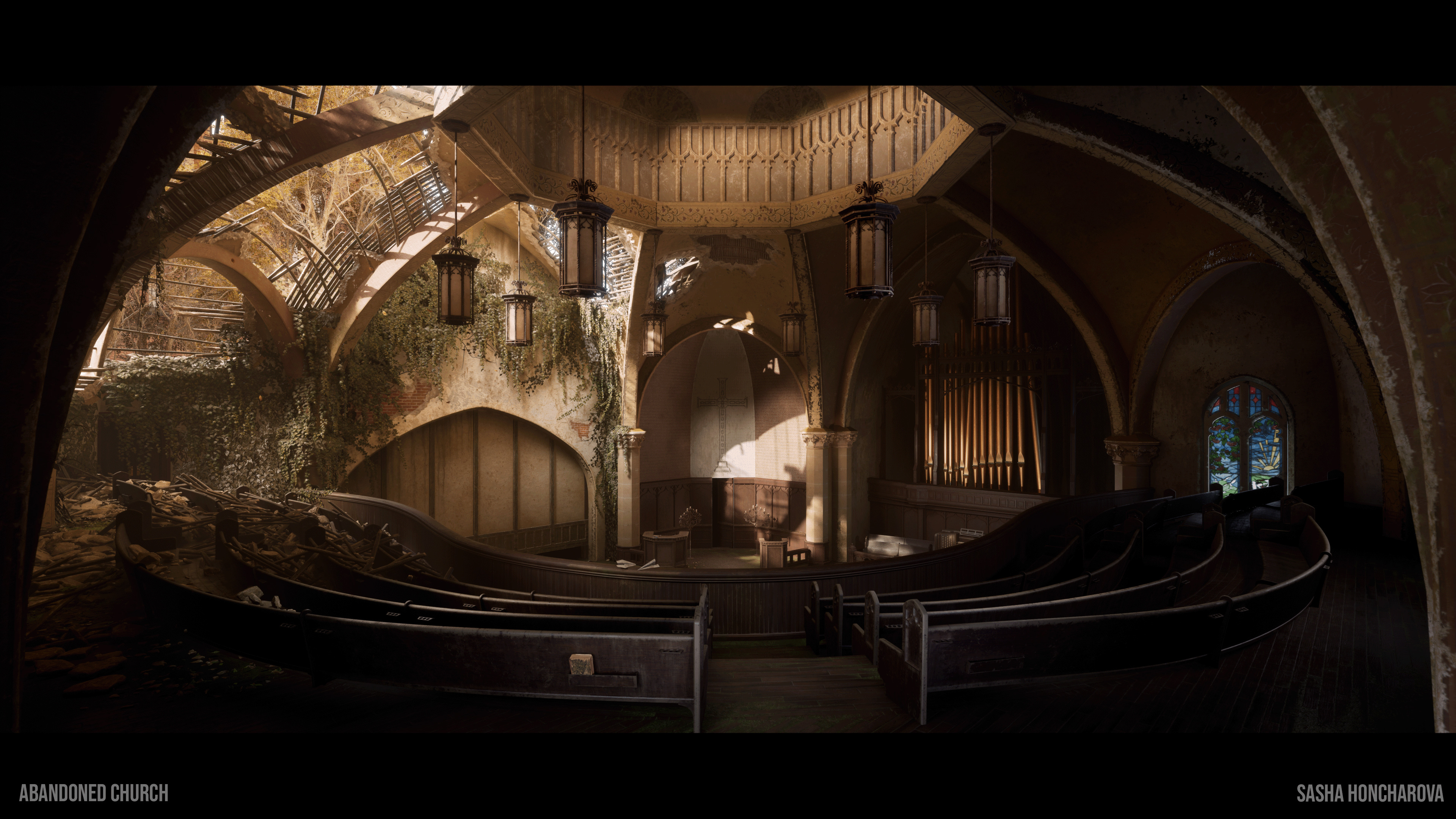 Саша Гончарова подробно рассказала о работе над проектом «Abandoned Church», показала процесс текстурирования и выбор материалов, объяснила, как устроено освещение.