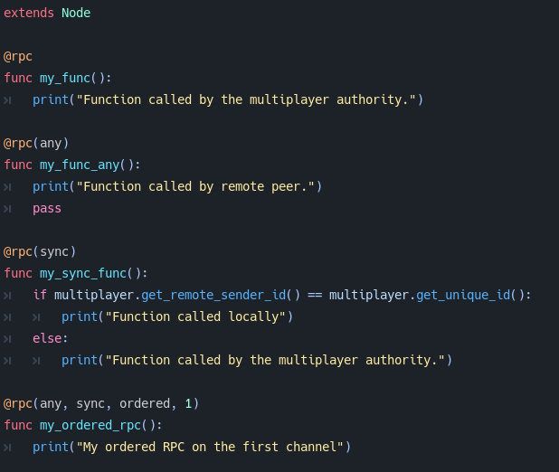 Добавили унифицированную аннотацию @rpc. Для локального вызова теперь параметром задаётся @rpc(sync), упростили вызов RPC. А так же добавили каналы и возможность задать необходимость гарантировать порядок для unreliable сообщений: @rpc(ordered).
