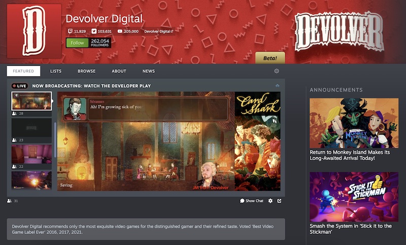 Само собой, ежегодные распродажи для конкретных издателей и возможности перекрёстного продвижения. Но также и персонализированная страница издателя, которую предоставляет Steam, и за которой могут «следовать» игроки.