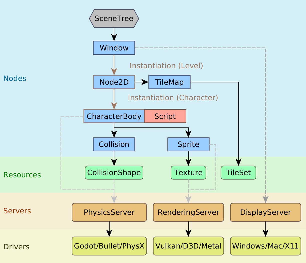Одной из уникальных особенностей Godot является возможность использовать ноды высокого уровня для меньшего количества сложных объектов или серверы низкого уровня для большого количества простых.