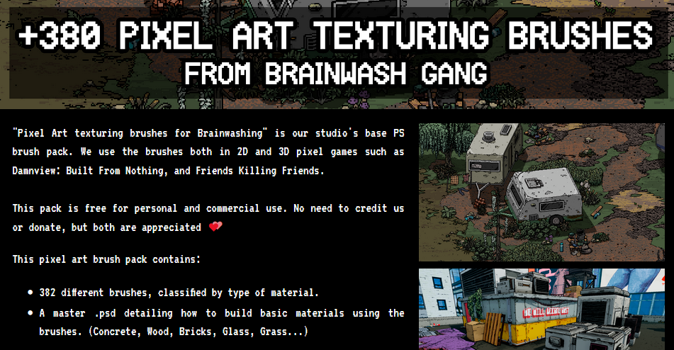 Разработчик Brainwash Gang выложил коллекцию из 382 пиксель-арт кистей для текстурирования совершенно бесплатно.