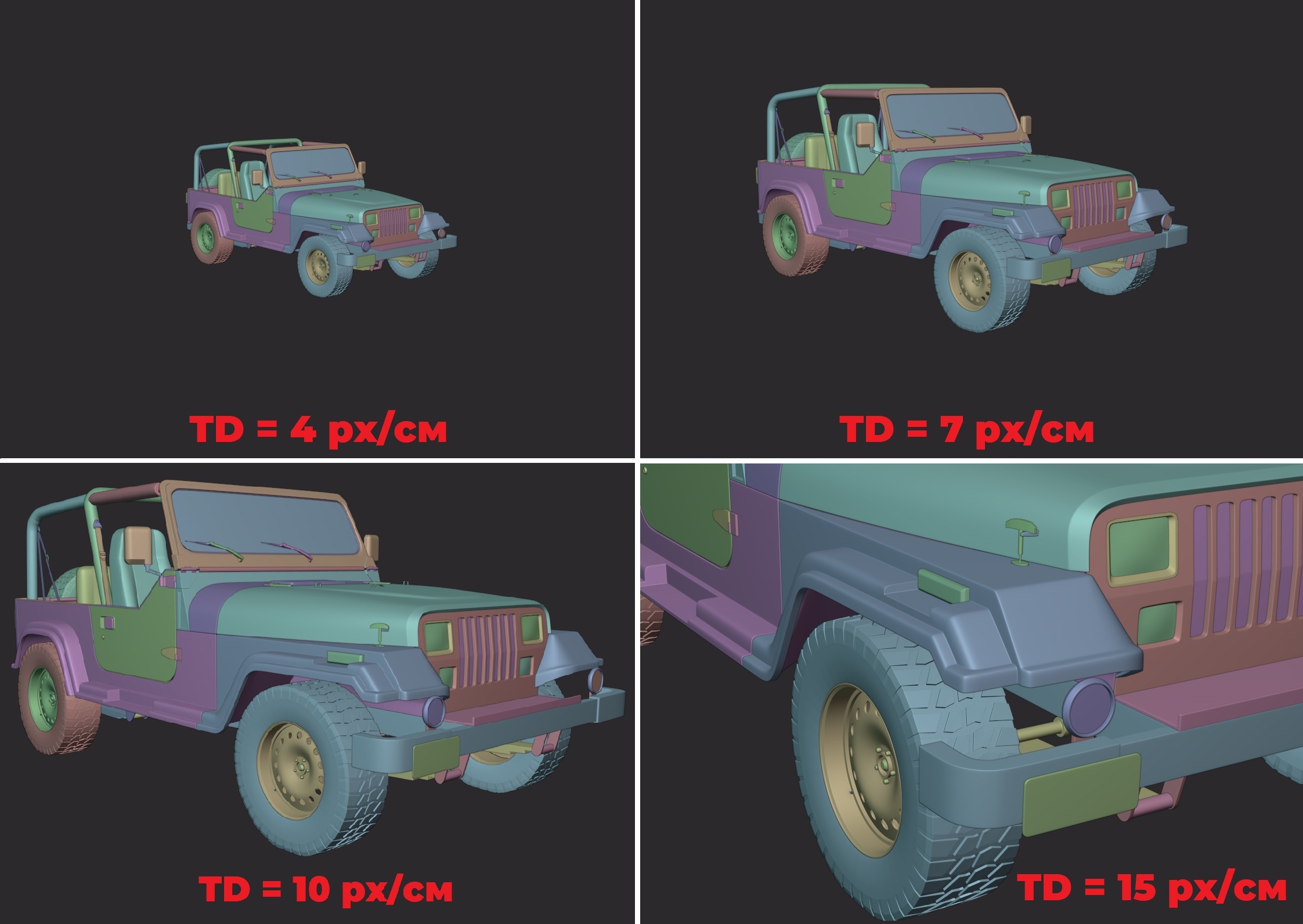 Плотность текселя показывает сколько пикселей будет содержать размерная единица модели px/см. Чем больше значение, тем больше пикселей будет выделено на отрисовку деталей, соответственно тем выше качество картинки. Обратной стороной высокого качества является высокий вес текстур, и как следствие движок будет дольше просчитывать отрисовку. Чтобы вес текстур не был лишним, значение TD надо подбирать.