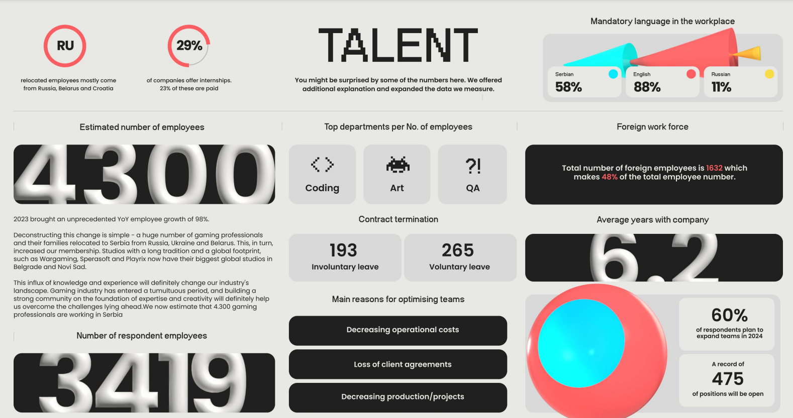 Согласно Сербской игровой ассоциации (SGA), на конец 2023 года в стране зафиксировано 3400 разработчиков игр.