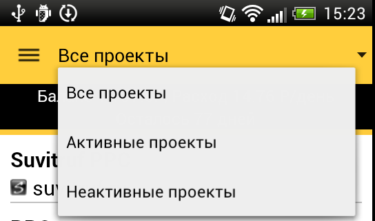 // установка типа навигацииgetActionBar().setNavigationMode( ActionBar.NAVIGATION_MODE_LIST);// листенер на клики по элементам менюOnNavigationListener mOnNavigationListener = new OnNavigationListener() {@Overridepublic boolean onNavigationItemSelected(int position, long itemId) {return true;}}; // кастомный адаптер для Spinner'аArrayAdapter<CharSequence> barAdapter = new ArrayAdapter<CharSequence>(mContext, R.layout.projects_filter_item, android.R.id.text1, mContext.getResources().getStringArray( R.array.projects_filteres));barAdapter.setDropDownViewResource( android.R.layout.simple_spinner_dropdown_item);getActionBar().setListNavigationCallbacks(barAdapter, mOnNavigationListener);// скрываем TitlegetActionBar().setDisplayShowTitleEnabled(false);Это хорошо, если у вас этот элемент на всех экранах/фрагментах нужен. Но если на разных фрагментах Action Bar должен выглядеть абсолютно по-разному, что делать? Разумным будет использовать меню и переопределять onCreateOptionsMenu по надобности. Вот только меню всегда будет по ширине элемента и прибито к правому краю Action Bar’а. Что же делать? Свой кастомый слой для Spinner‘а писать. Для начала, сам код меню: