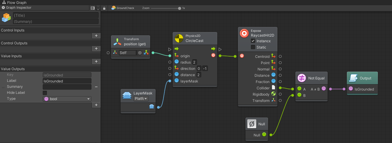 - Перетаскиваем на граф персонажа граф GroundCheck.