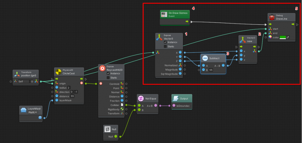 - Результат проверки столкновения луча с платформой пишем в bool переменную IsGrounded на выход.
